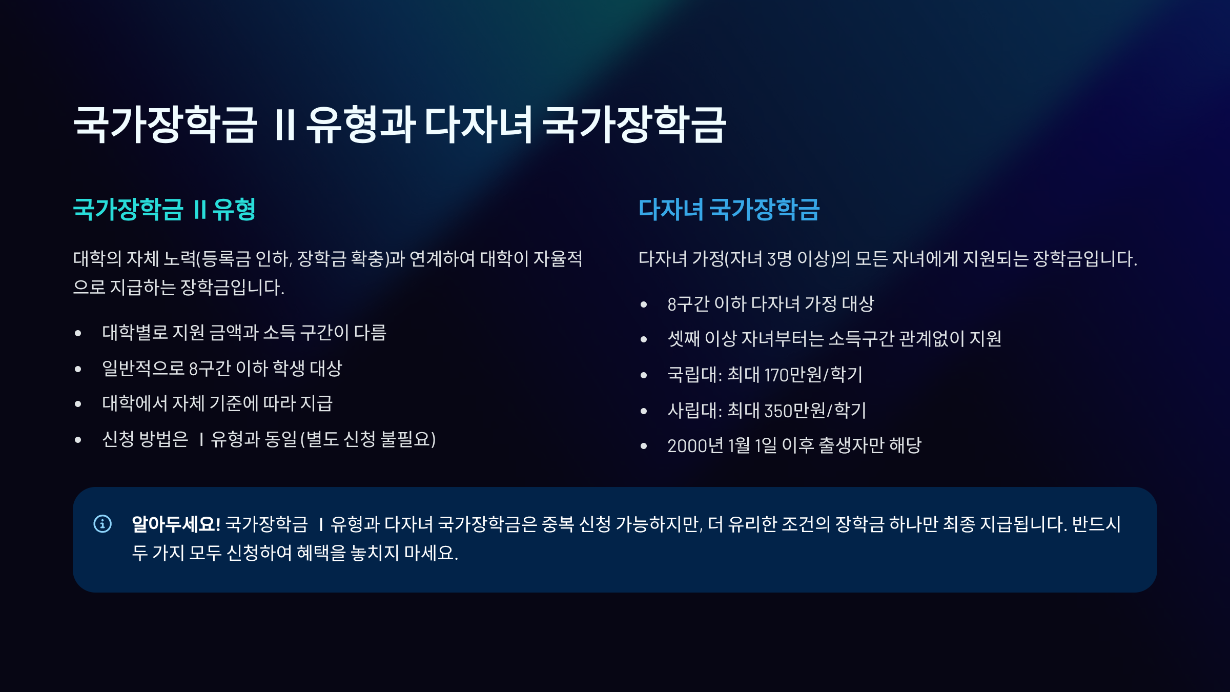 국가장학금은 Ⅰ유형 외에도 Ⅱ유형(대학연계지원형)과 다자녀 국가장학금이 있습니다. Ⅱ유형은 대학의 자체 기준에 따라 등록금 감면을 지원하며, 대학별로 지원 금액이 상이하므로 한국장학재단 홈페이지에서 소속 대학의 참여 여부와 지원 기준을 반드시 확인해야 합니다. 다자녀 국가장학금은 2025년부터 셋째 자녀가 아니어도 모든 자녀에게 등록금 전액 지원이 확대되었습니다.
