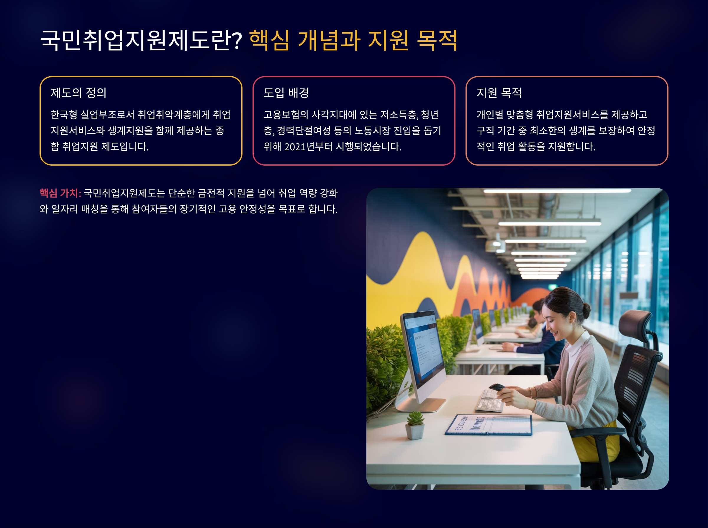 2021년 1월부터 시행되어, 구직자에게 경제적 지원은 물론, 취업 능력 향상을 위한 다양한 서비스까지 종합적으로 제공하고 있습니다.