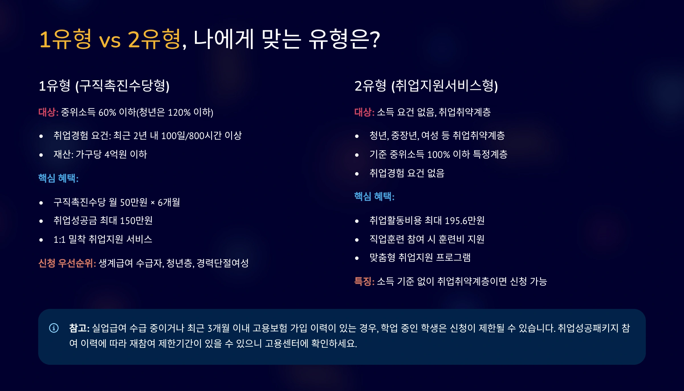 국민취업지원제도는 신청자의 소득과 재산, 취업 경험에 따라 크게 두 가지 유형으로 나뉩니다. 각 유형별 지원 내용과 자격 요건이 다르므로, 본인이 어떤 유형에 속하는지 정확히 파악하는 것이 중요합니다.