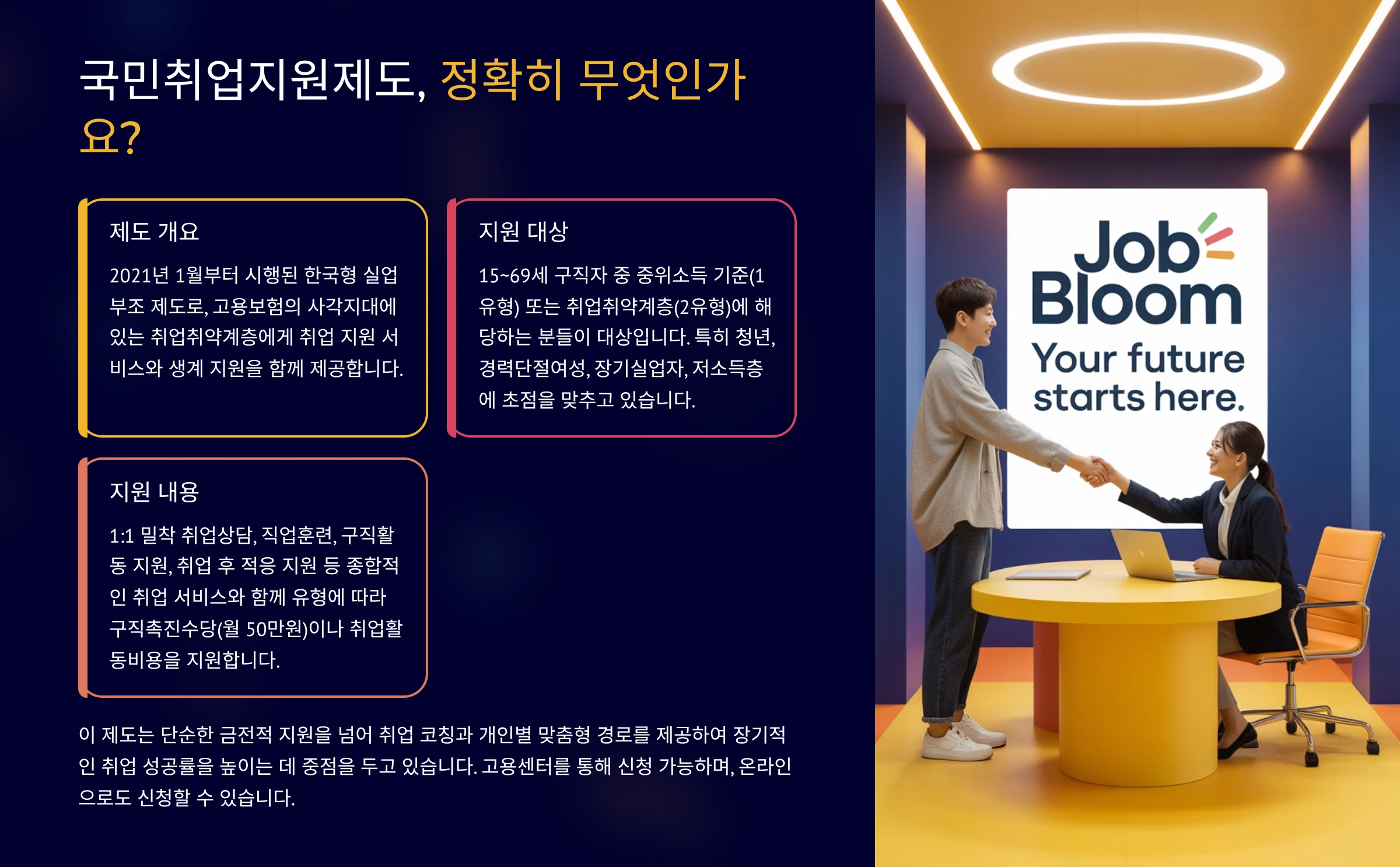 이 제도는 취업을 원하는 분들에게 맞춤형 취업지원 서비스는 물론, 생계 안정을 위한 소득까지 제공하여 구직 활동에만 집중할 수 있는 환경을 만들어 줍니다.
