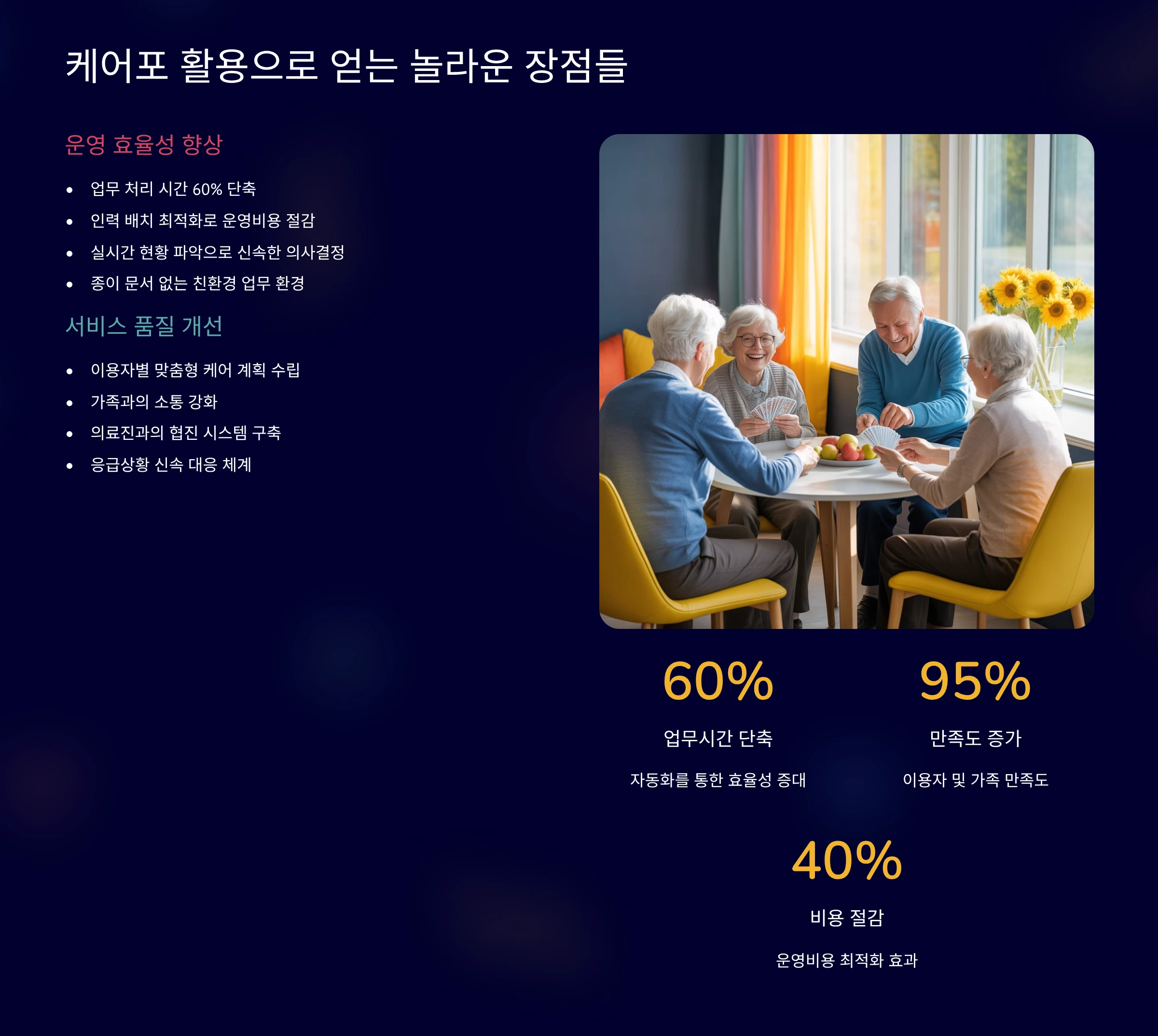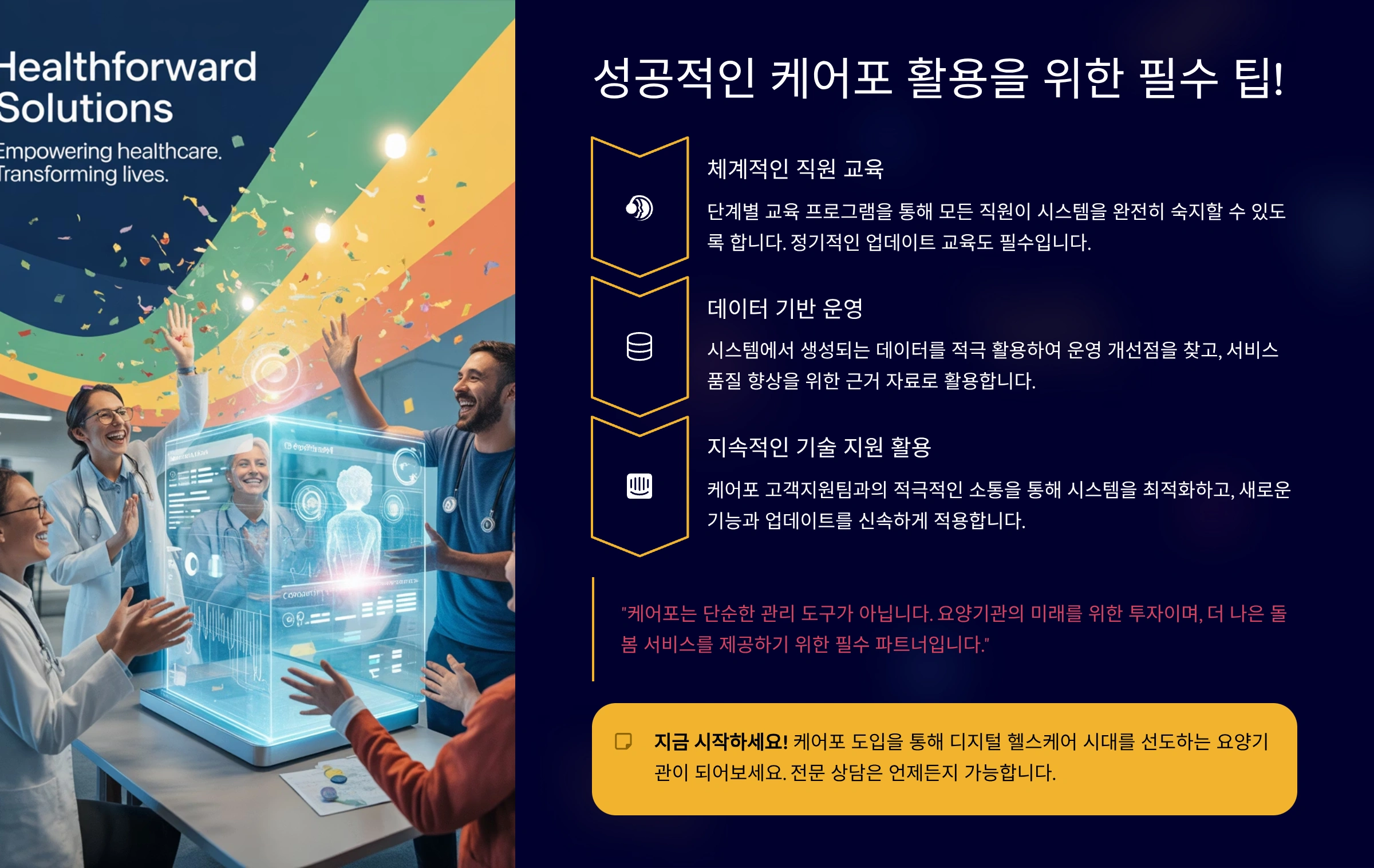 즉, 케어포는 성공적인 장기요양기관 운영을 위한 필수적인 파트너라고 할 수 있습니다.