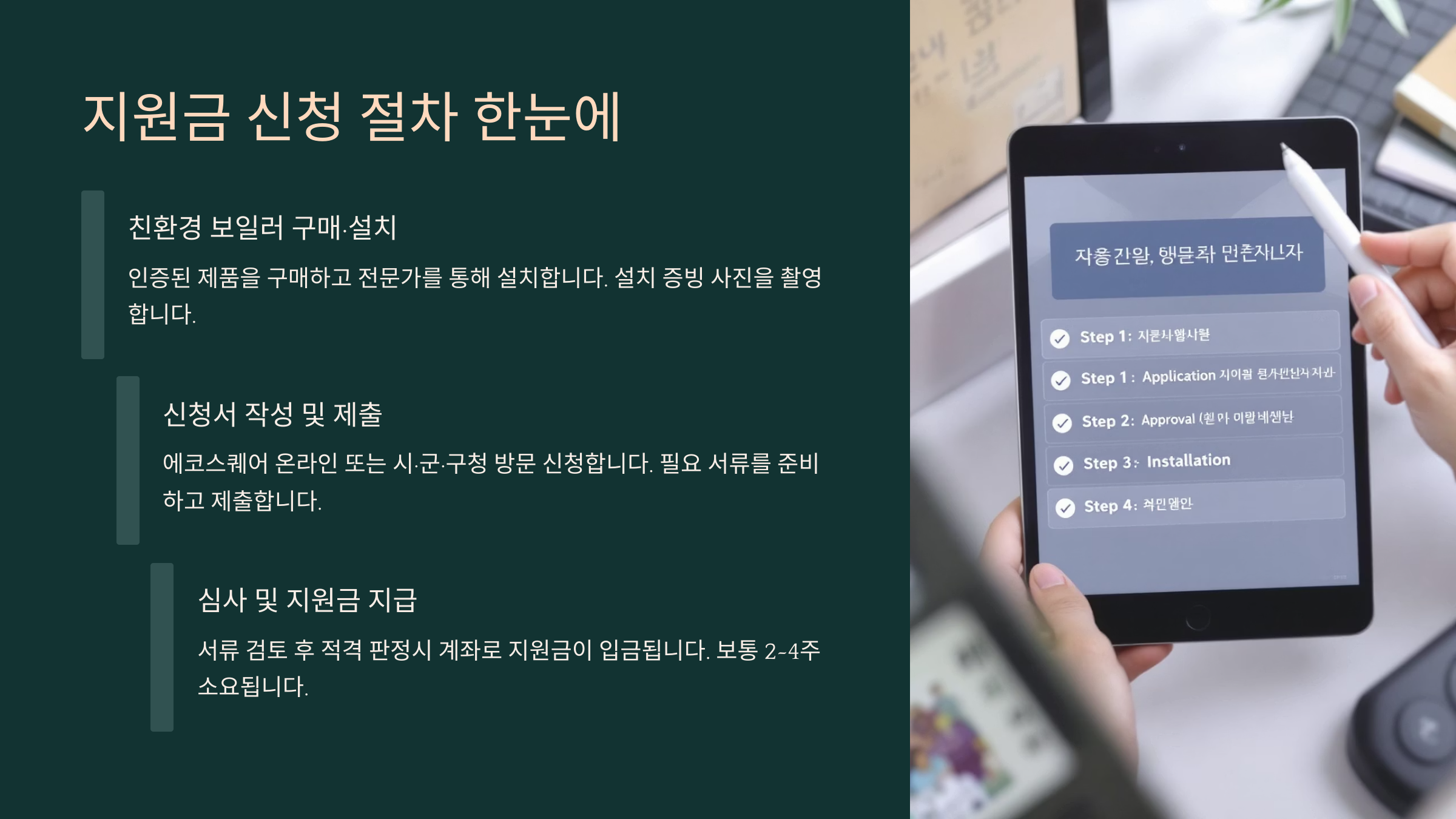 3. 서류 제출: 주민등록등본, 소득 증명서, 보일러 구매 계약서 사본 등 필요한 서류를 PDF나 이미지 파일로 변환하여 업로드합니다.