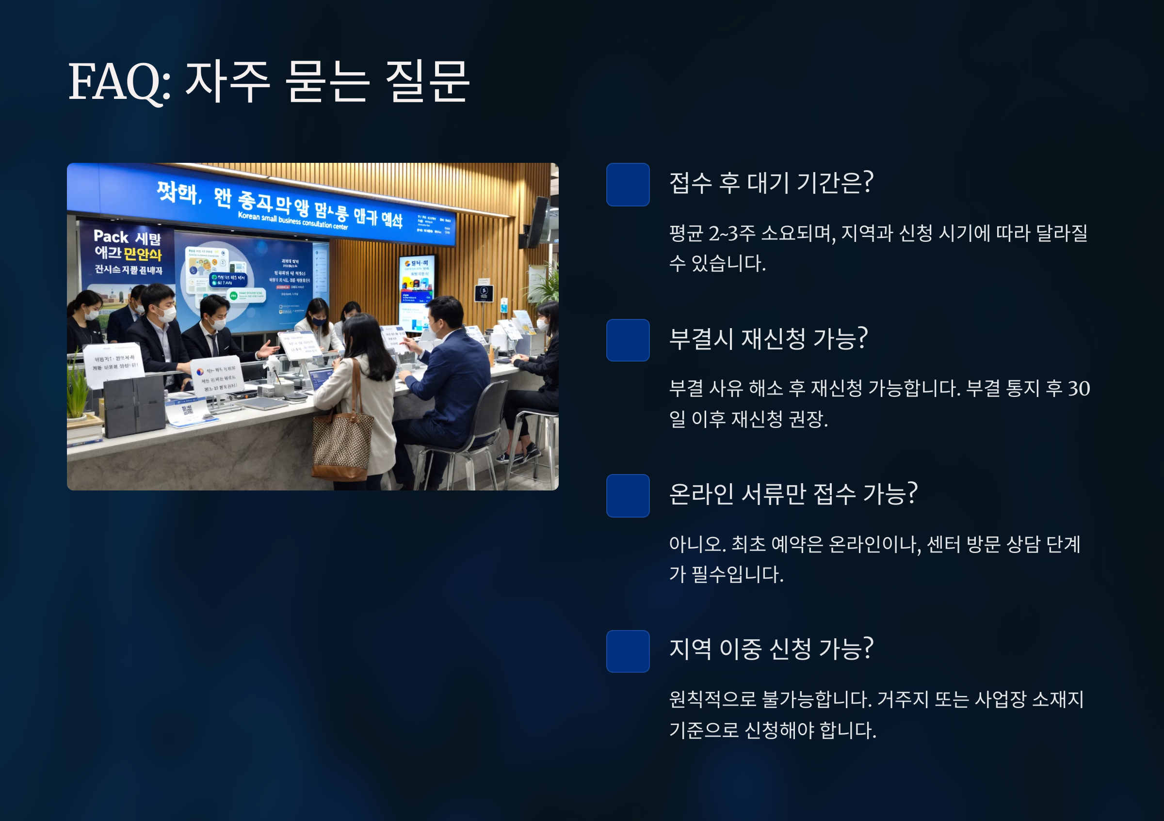 이를 예방하기 위해서는 우선 신용조회 서비스를 통해 사전에 신용점수를 확인하고, 필요하다면 개선 조치를 취하는 것이 좋습니다. 또한 사업계획서를 구체적으로 작성하는 것이 중요합니다. 지역 소상공인지원센터에서는 사전 상담 서비스를 제공하므로, 신청 전 전문가의 조언을 받는 것도 소상공인 정책자금 심사기간을 효율적으로 활용하는 방법입니다.