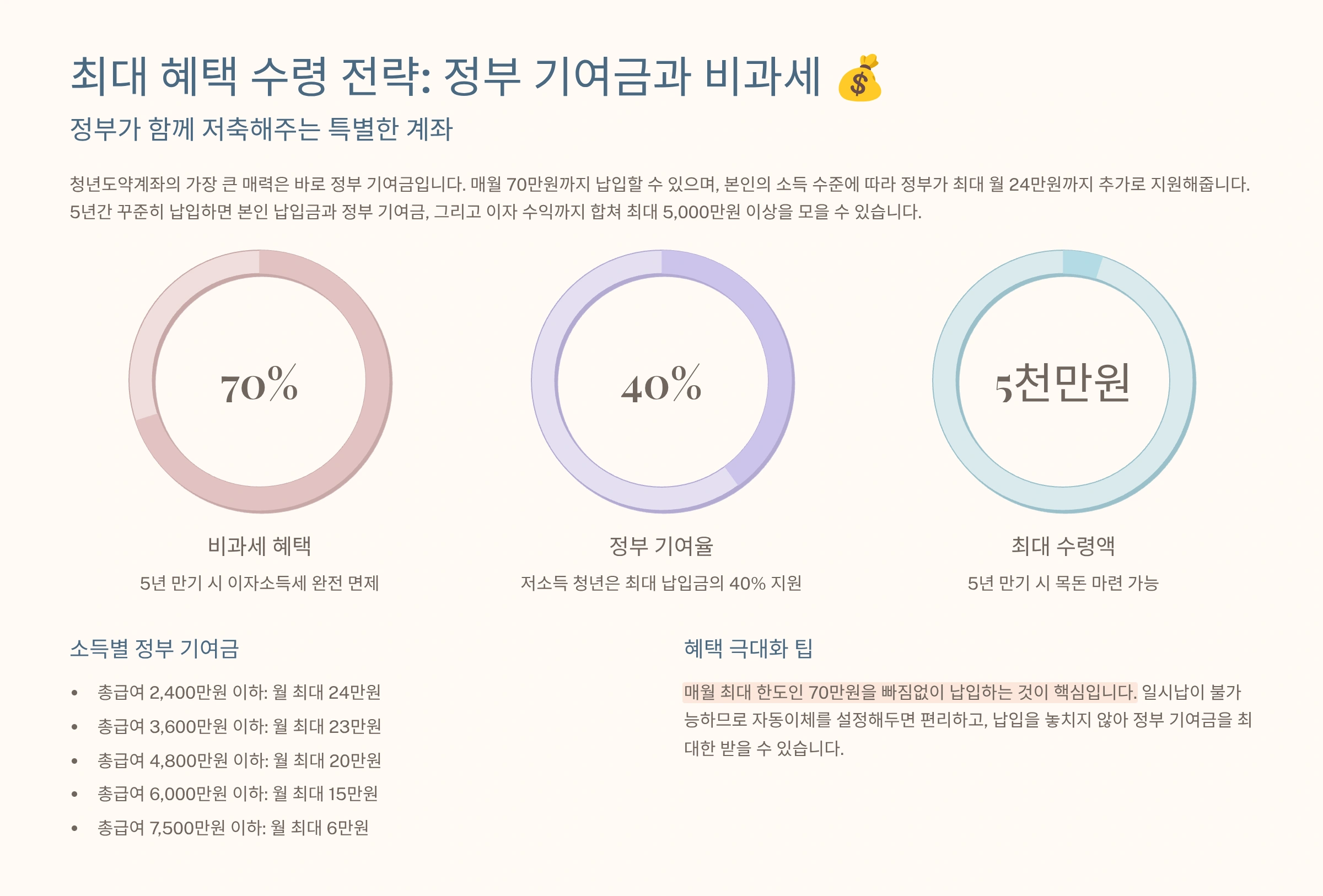 청년도약계좌의 가장 큰 매력은 바로 정부 기여금과 비과세 혜택입니다. 이 두 가지를 최대한 활용하는 것이 목돈 마련의 핵심 전략입니다. 정부 기여금은 개인 소득에 따라 차등 지급되는데, 소득이 낮을수록 더 많은 기여금을 받을 수 있습니다. 2025년에는 이 기여금 상한이 더 높아질 것으로 예상되어, 저소득 청년들에게는 더욱 유리한 기회가 될 것입니다.