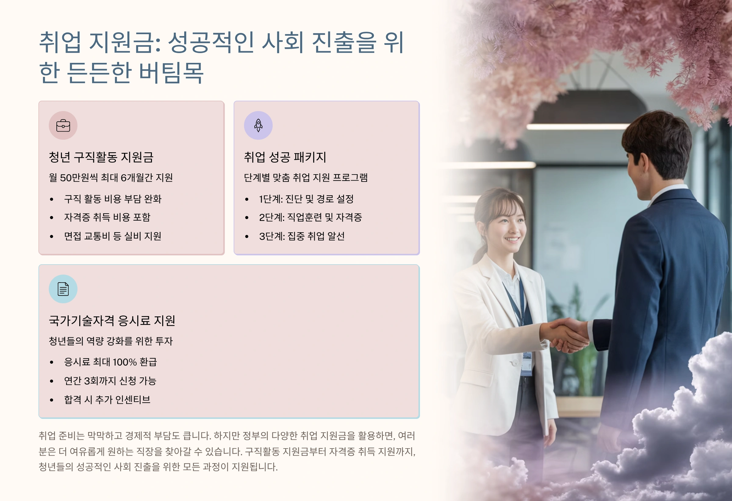 학업을 마친 후 사회로 첫발을 내딛는 청년들에게는 취업 준비 과정과 초기 정착에 많은 비용이 발생합니다. 2025년 정부는 이러한 청년들의 부담을 덜고, 성공적인 취업과 안정적인 정착을 돕기 위한 다양한 취업 지원금을 확대 운영하고 있습니다.