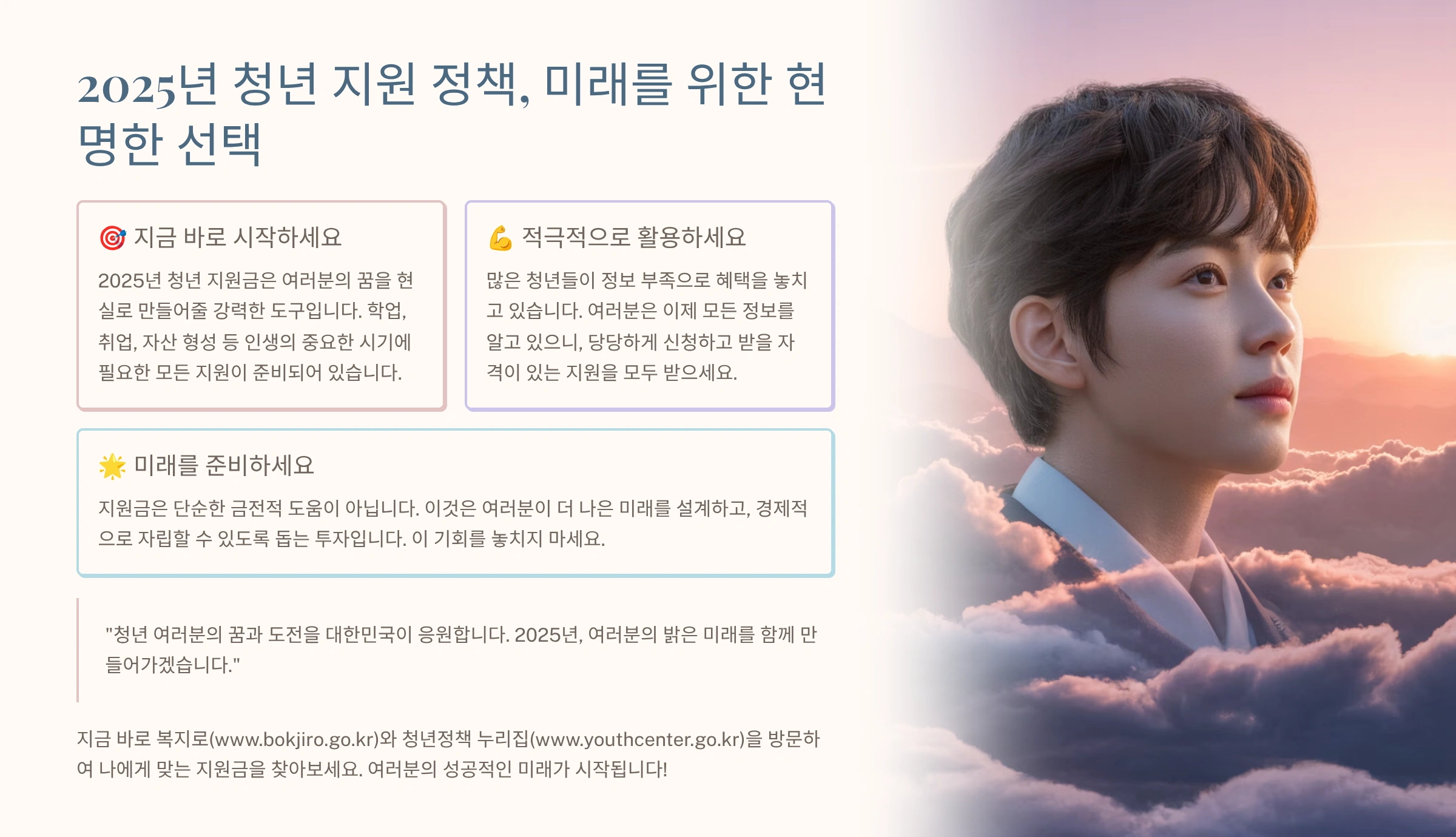 2025년은 청년 여러분들이 학업과 취업이라는 두 마리 토끼를 잡을 수 있는 절호의 기회를 제공하고 있습니다. 정부의 적극적인 지원 정책들은 청년들이 경제적 어려움으로 인해 꿈을 포기하지 않도록 돕고, 더 밝은 미래를 향해 나아갈 수 있도록 든든한 버팀목이 되어줄 것입니다.