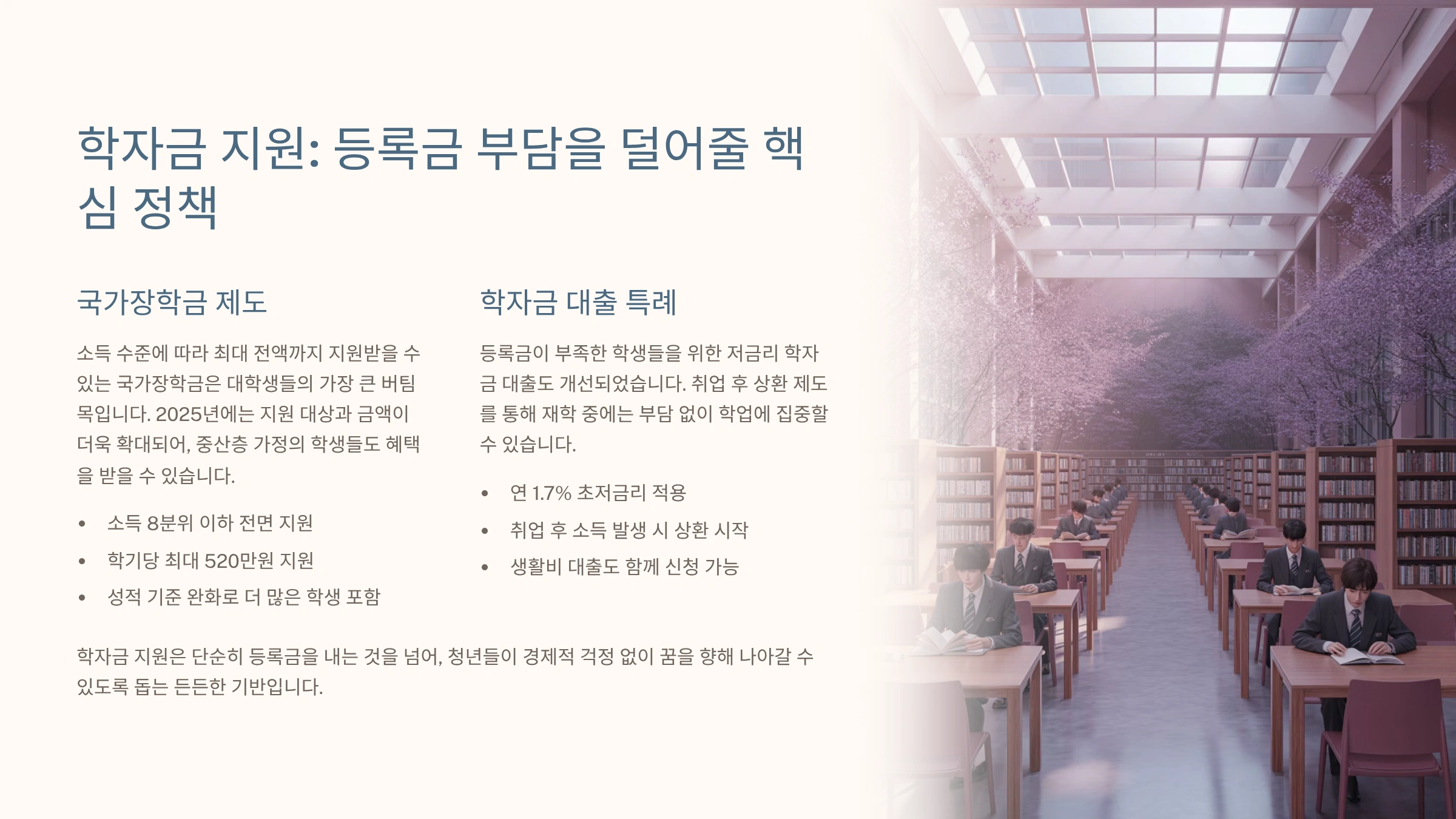 학자금 부담은 많은 청년들이 학업을 이어가는 데 가장 큰 걸림돌 중 하나입니다. 2025년에는 이러한 부담을 획기적으로 줄여줄 다양한 학자금 지원 정책들이 시행되고 있습니다. 저는 이 부분이 청년들의 학업 지속 가능성을 높이는 데 가장 중요하다고 생각합니다.