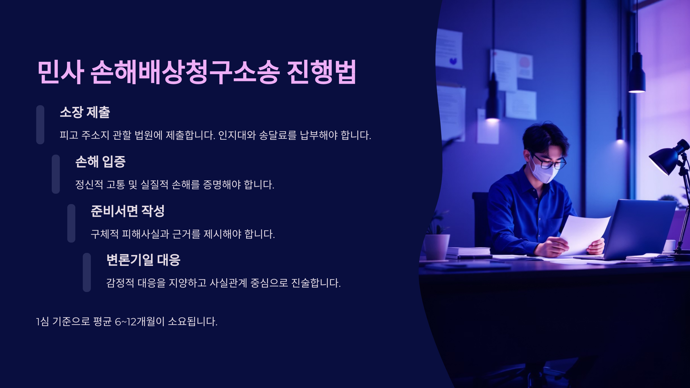 | 소장 접수 | 법원에 손해배상 소장 제출 | 피해자(원고) | 1일 |