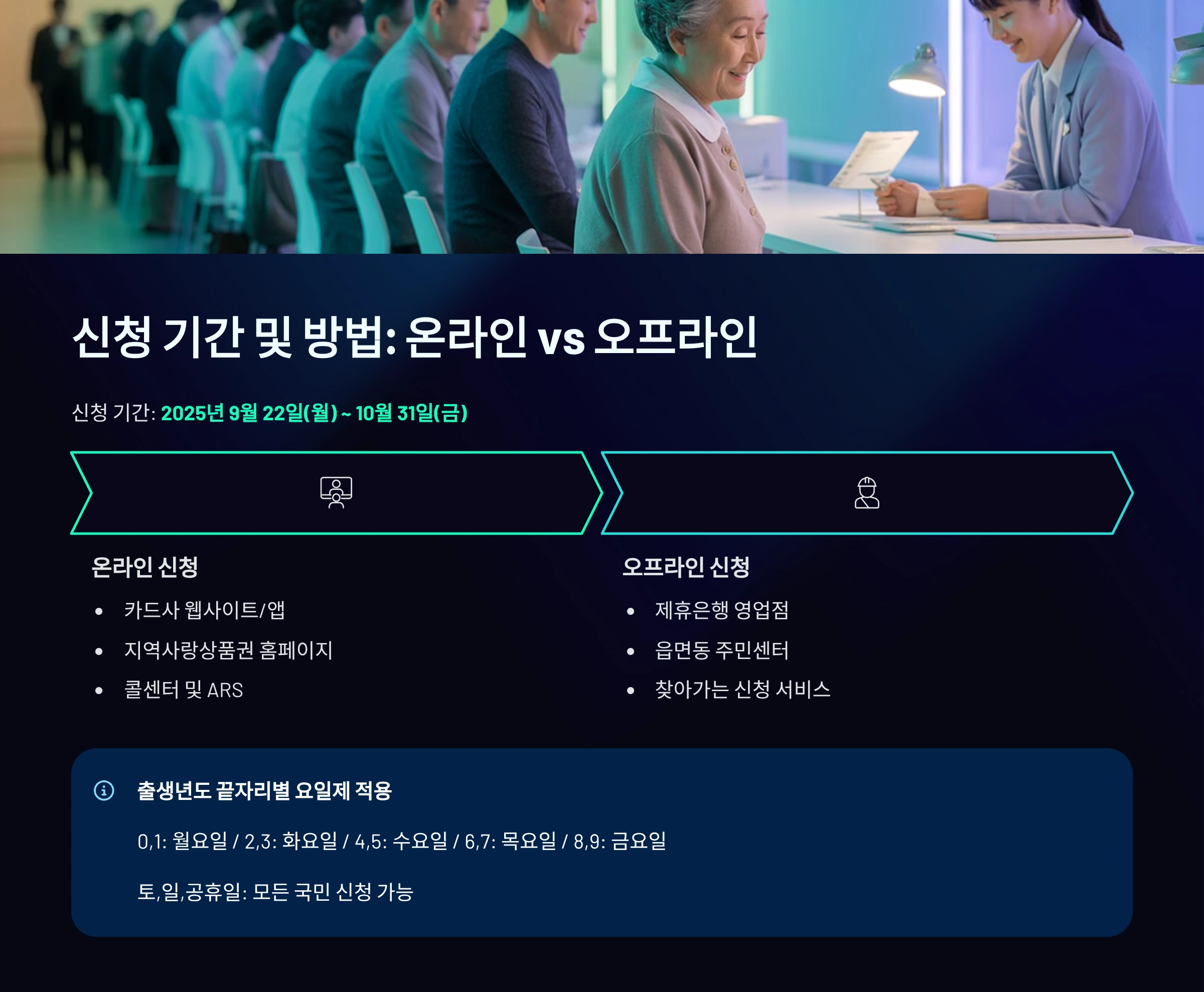 - 오프라인 신청: 주소지 관할 읍면동 주민센터나 제휴 은행 영업점에서 신청할 수 있습니다. 신분증을 지참하고 방문해야 합니다.