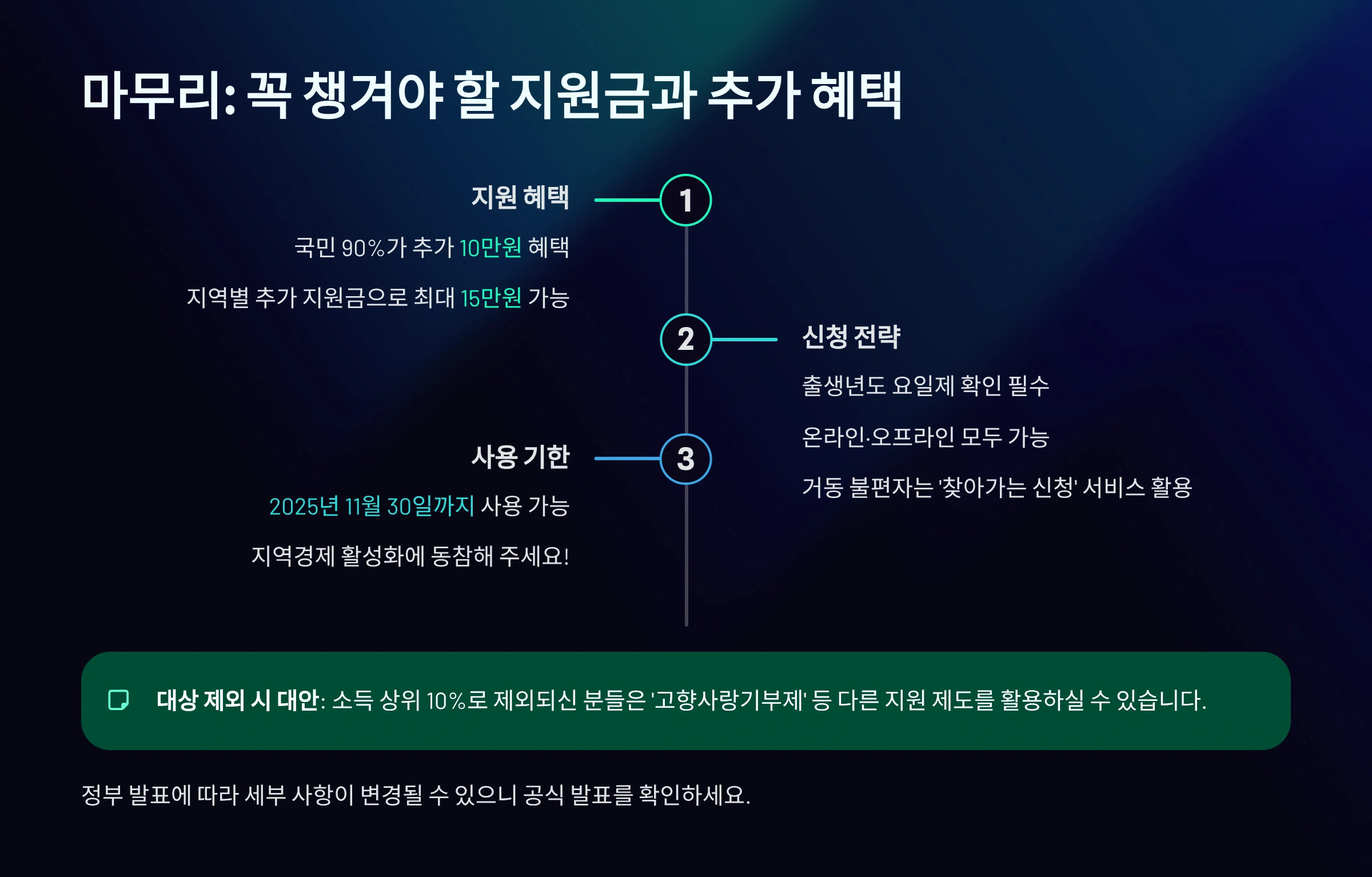 첫째, 지급받은 지원금은 2025년 11월 30일까지 모두 사용해야 합니다. 미사용 잔액은 자동 소멸되므로 늦지 않게 사용하는 것이 중요합니다.