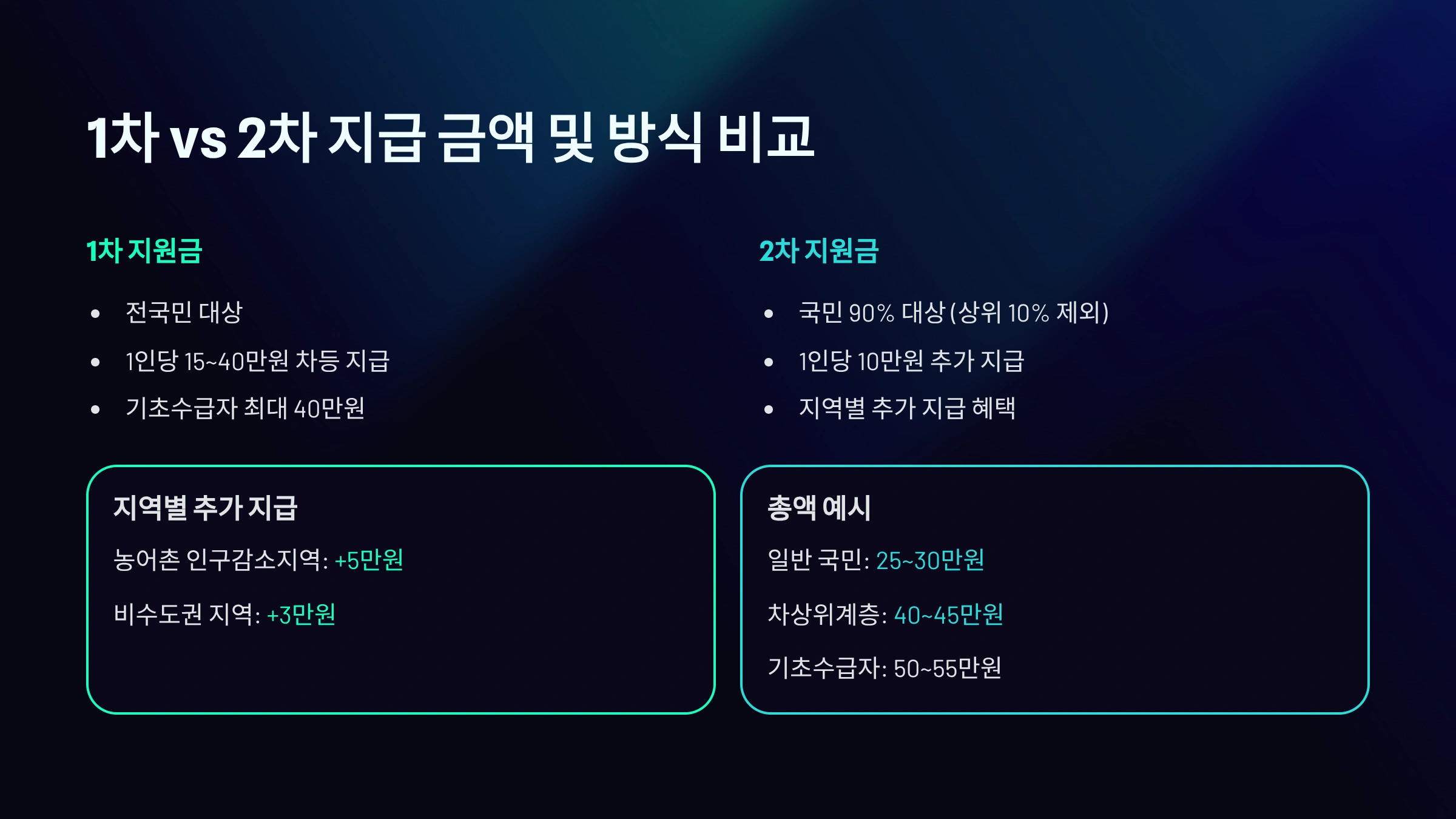 2025년 민생회복 지원금은 1차와 2차로 나뉘어 지급됩니다. 1차 지원금이 모든 국민에게 보편적으로 지급된 것과 달리, 2차 지원금은 '선별적' 지원이라는 점에서 가장 큰 차이를 보입니다.