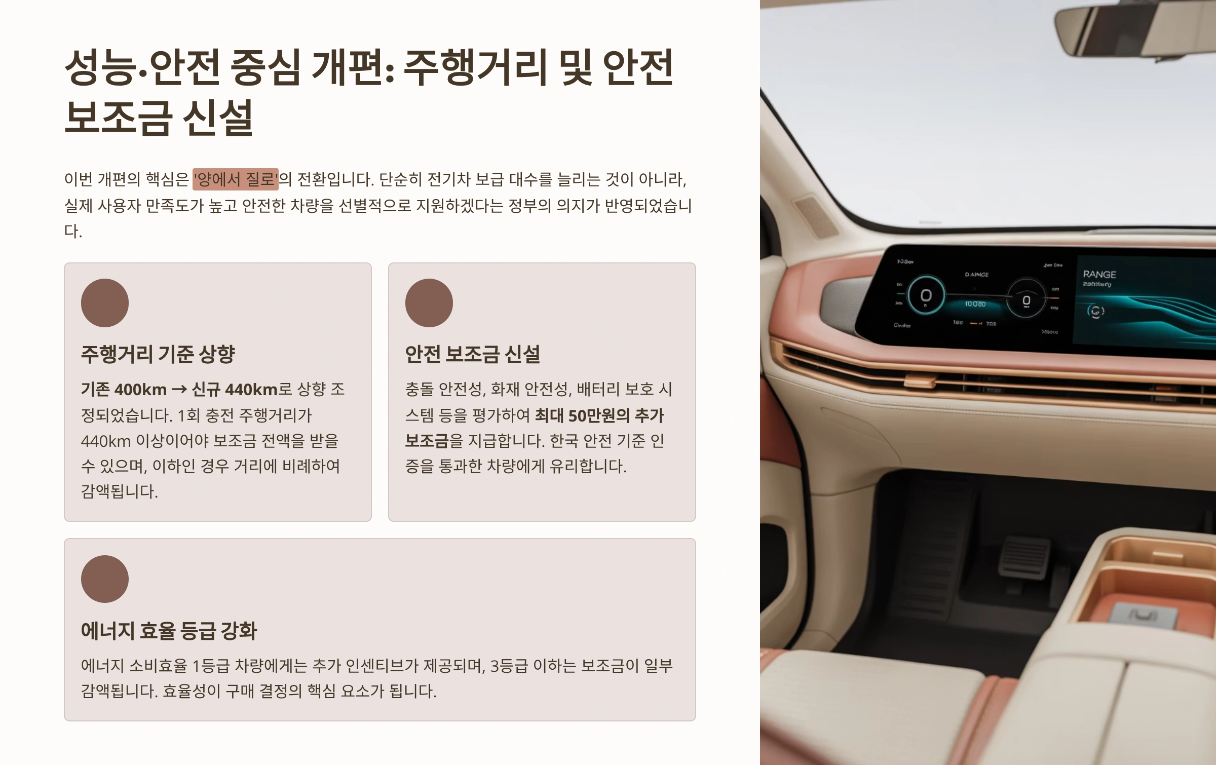 2025년 보조금 정책은 '더 멀리 가고, 더 안전한 차'에 혜택을 집중합니다. 어중간한 성능의 전기차가 보조금을 받는 것을 막겠다는 의지가 보입니다.