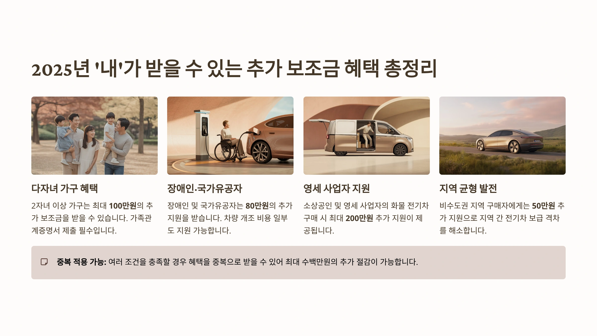 이 글은 2025년 전기차 보조금 정책에 대한 일반적인 정보 제공을 목적으로 작성되었으며, 전문적인 금융 또는 구매 조언이 될 수 없습니다. 보조금 정책은 정부 및 지자체의 사정에 따라 변경될 수 있으며, 개인의 상황과 차량 모델에 따라 실제 지급액은 달라질 수 있습니다. 모든 구매 결정은 개인의 판단과 책임 하에 이루어져야 하며, 최종 구매 전 반드시 무공해차 구매보조금 지원시스템(www.ev.or.kr) 및 해당 지자체의 최신 공고를 확인하시기 바랍니다. 본 정보로 인한 직간접적 손해에 대해 책임지지 않습니다.